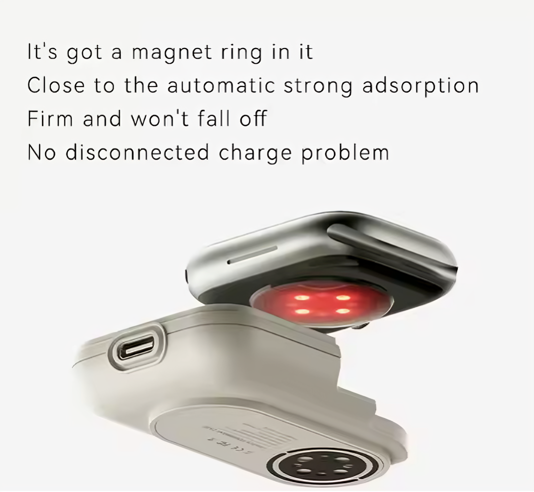 Never let your Apple Watch run out of power again with this Magnetic Wrist Charger. Worn like a wristband, it doubles as a power bank and charger for your watch, using a secure magnetic module for wireless charging on the go. With a 1000mAh battery, it’s perfect for travel, work, or emergencies. Compact, stylish, and functional—charge your watch anytime, anywhere without cables or outlets.