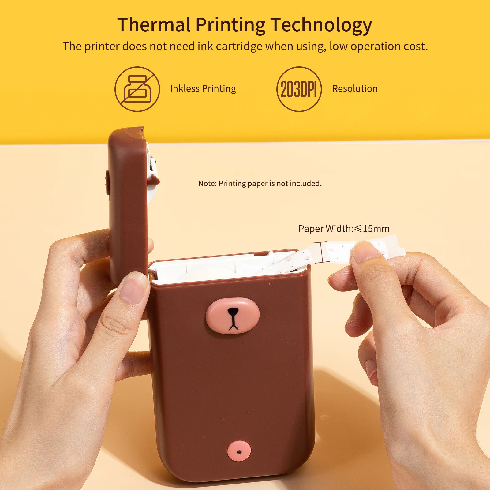 🖨️ Inkless Printing : Thermal printing, 203DPI resolution, low printing noise, the printer does not need ink cartridge when using, low operation cost. Support paper width ≤15mm.